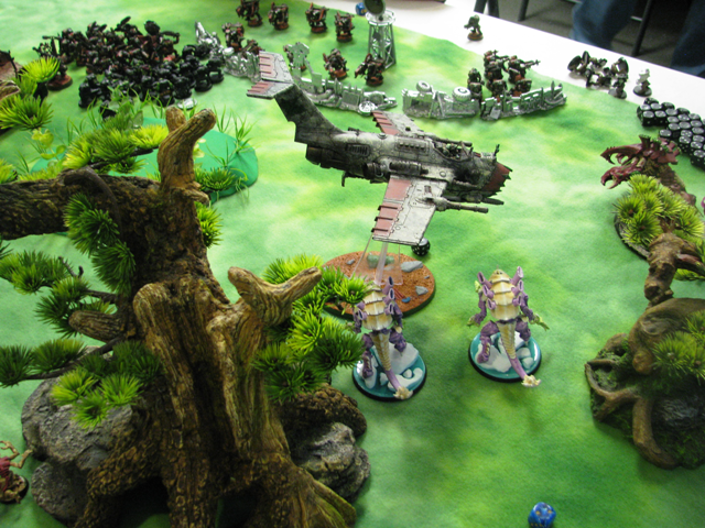 Those Ymargls are just chilling for now. you can see the large piece we placed (mainly in our half) to provide a potential Ymargl landing zone. The Tree to the right blocks LOS and we hid our Genestealers there.